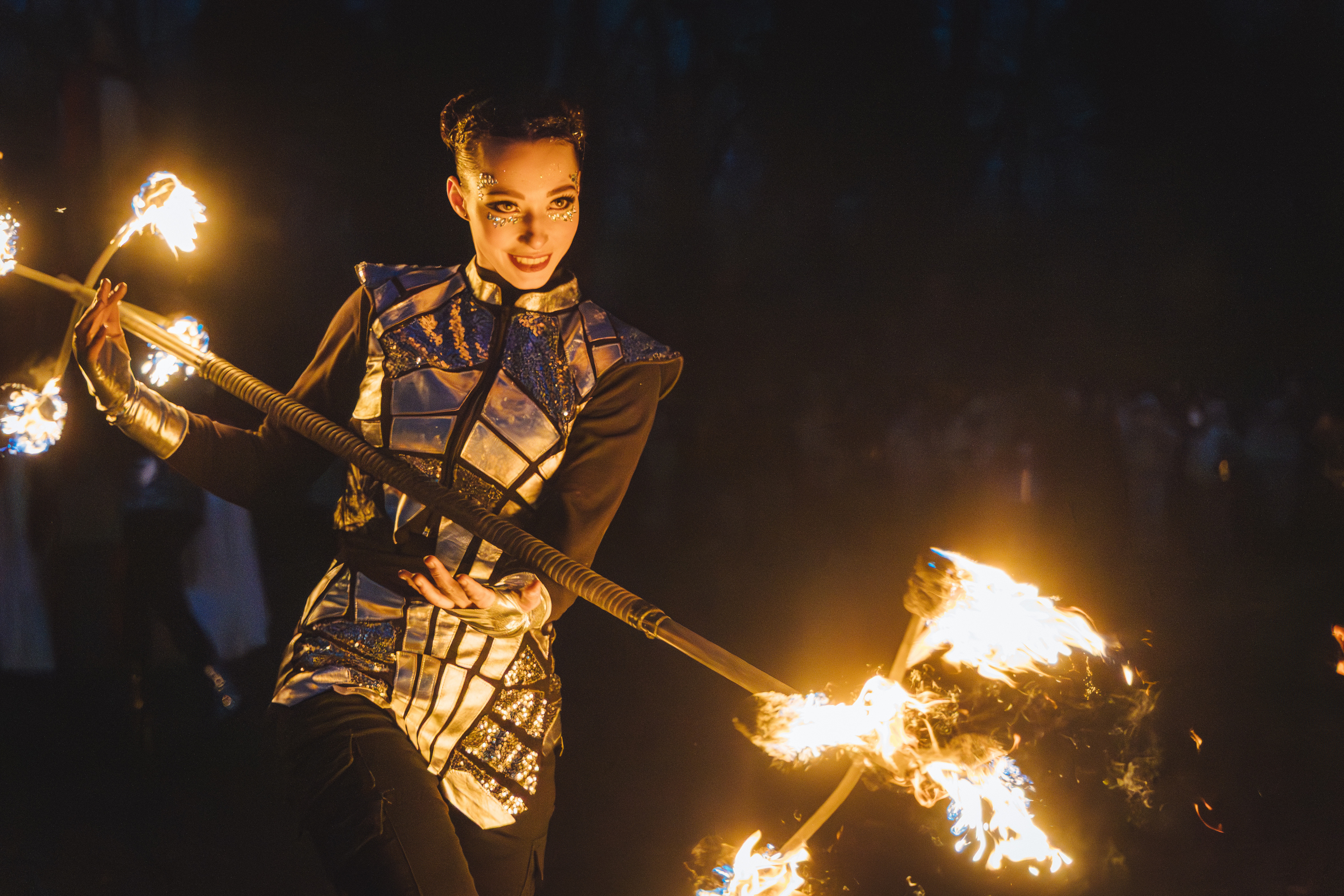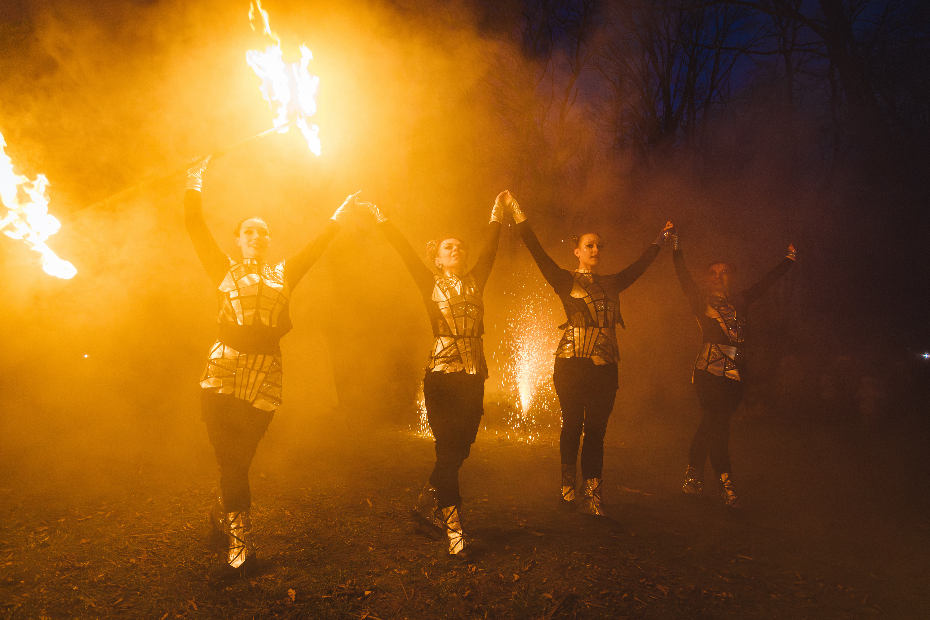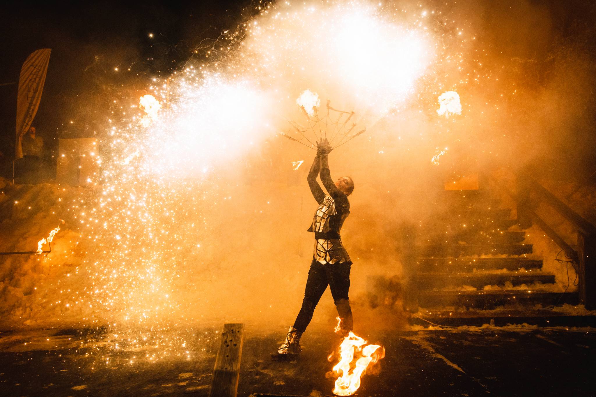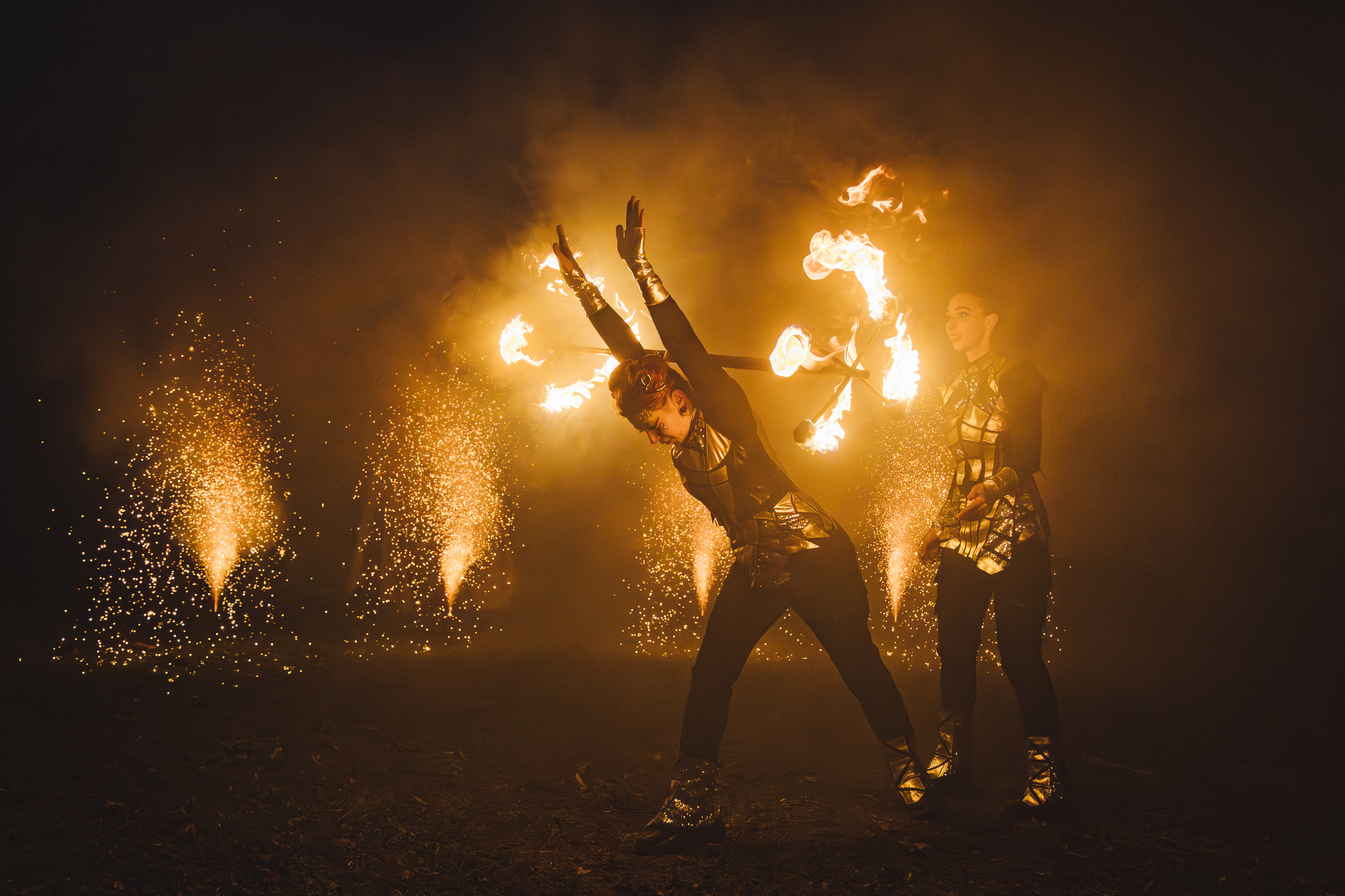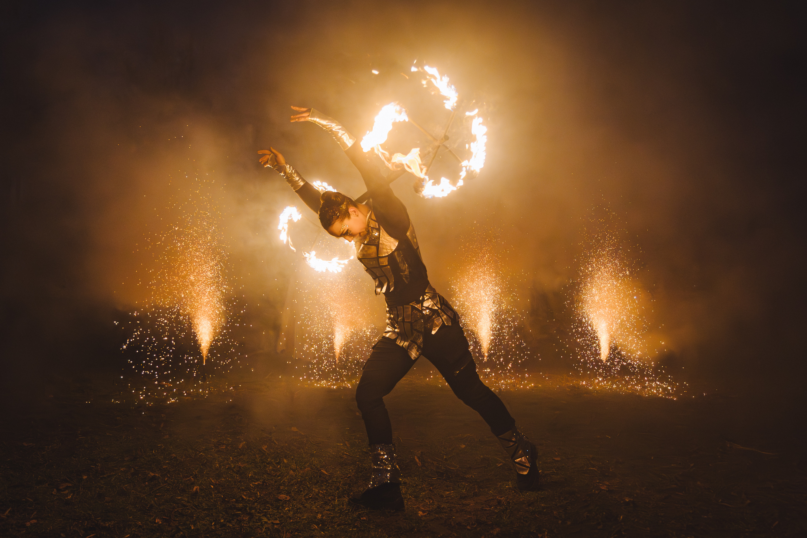 Вогняні інструменти та піротехніка інтегровані у хореографію так, щоб створювати ефект повноцінного сценічного перформансу.